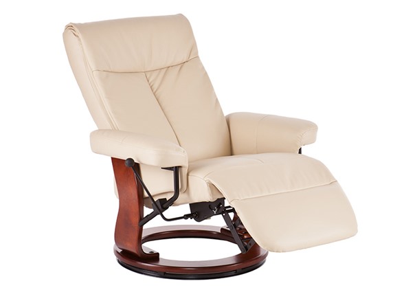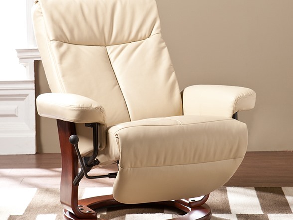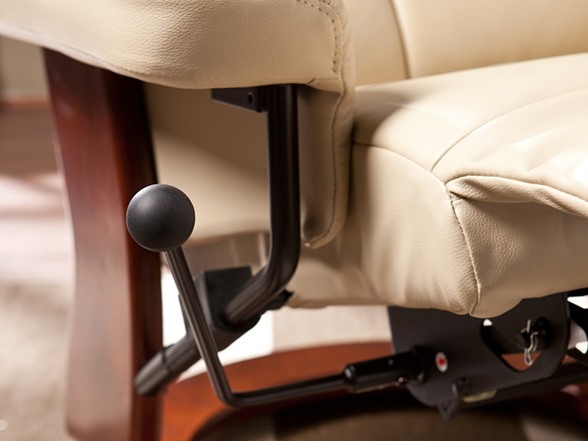 Sleek style meets extreme comfort with this stylish ergonomic recliner with an innovative hidden ottoman and articulating headrest. Dual levers set four main reclining positions that maintain proper body alignment while providing decompression and back strain relief. Sink back in the lay-flat position to help improve digestion, circulation, and overall comfort. Smooth taupe recliner and dark cherry finish "U base" create a contemporary design for ultimate relaxation and support in any room.