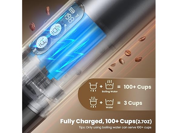 - 2-in-1 Portable Espresso Machine: This travel coffee maker works with ground coffee and coffee capsules. As a versatile 2-in-1 coffee maker, it allows you to quickly brew coffee using either freshly ground coffee or coffee capsules. Furthermore, it supports both cold water brewing and hot water brewing options. When fully charged about 3 hours with 5V 2A cable, it can brew approximately about 4 cups with 40ml of cold water or 2-3 cups with 80ml of cold water. For hot water brewing, it can make over 100 cups of delicious coffee.