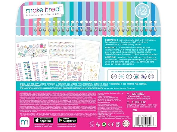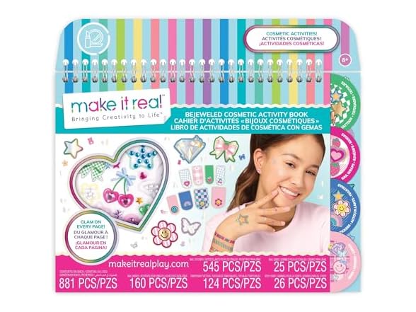 MIR: BEJEWELED COSMETIC ACTIVITY BOOK - It’s art, but you’re the canvas! Flip through this full activity book and discover a dazzling selection of temporary tattoos, nail art, and body gems to glam up your look and complement any outfit-of-the-day. Add some glamor to each day and switch up the style as much as the heart desires! The Make It Real Bejeweled Cosmetic Activity Book encourages self-expression in budding fashionistas. Get creative placing the gems in fun patterns to embellish makeup and enhance looks with adorable glitter freckle tattoos. Great as a gift for any occasion, whether it’s for a birthday bash, holiday, or just because! Elevate playdates with this fun activity set. All cosmetics are safety tested for ages 8 years and up. With so many trendy designs and accessories to choose from, kids can explore their personal style and feel confident in every sparkle. Perfect for tweens who love all things glam, it’s a fun way to turn everyday routines into playful beauty moments. Bringing Creativity to Life! INCLUDES: 1 Cosmetic Activity Book with Instructions, 26 Body Gems, 25 Nail Gems, 545 Nail Stickers, 160 Nail Wraps, and 124 Temporary Tattoos.
