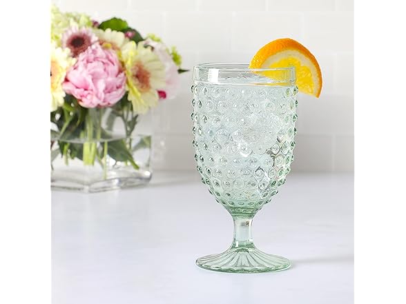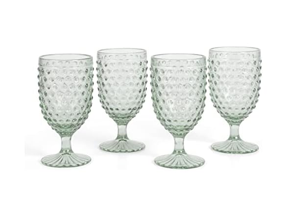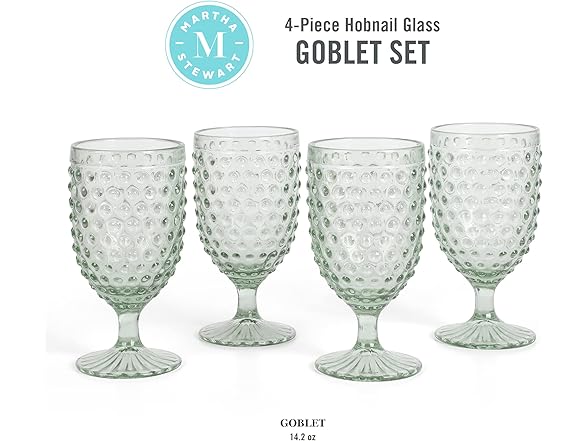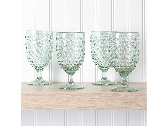Martha Stewart Chauncey 4-Pack Hobnail Glass Goblets, 14.2 oz – Handmade Green Vintage Drinking Glasses, Textured Glassware for Water, Wine, or Entertaining