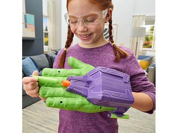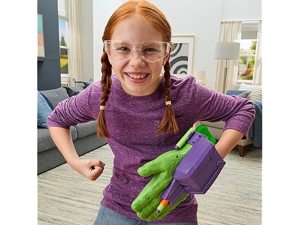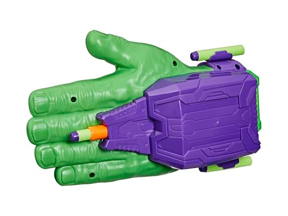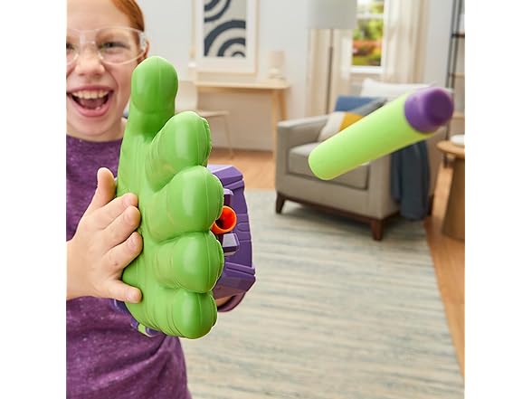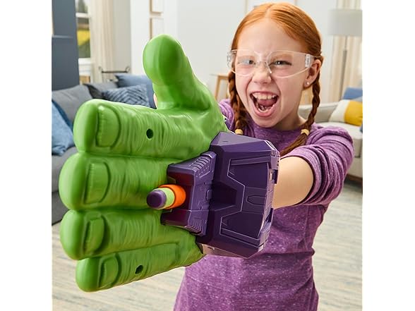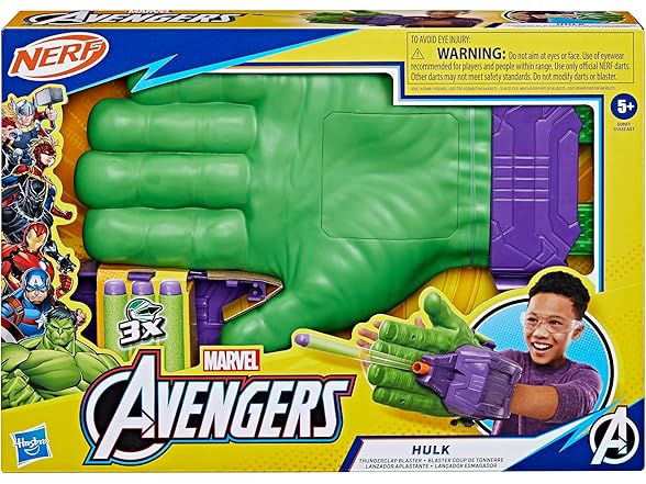 Gear up for superpowered action and adventure with the Marvel Avengers Hulk Thunderclap Blaster roleplay toy, powered by NERF! Kids can load 1 of the 3 included projectiles into the blaster, then prime it for launch by pulling back on the handle. To blast, simply clap hands together just like Hulk in the entertainment and comics. Includes storage for 2 additional darts on the sides of the blaster. Makes a great accessory to any Hulk costume. Look for more cool Marvel Avengers Super Hero toys for boys and girls to build a collection of action figures, toy vehicles, and roleplay gear, or give as gifts. (Each sold separately. Subject to availability.) Avengers assemble! Copyright MARVEL. All trademarks and registered trademarks are the property of their respective owners. HASBRO and all related trademarks and logos are trademarks of Hasbro, Inc.