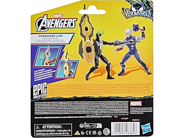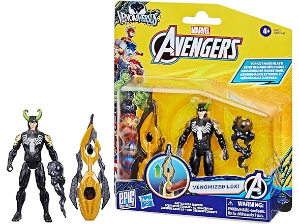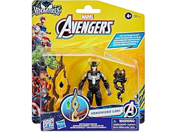 Kids can imagine powering up with Venomized battle gear to face off against the anti-venom Super Heroes! This Venomized Loki Marvel action figure is a part of Hasbro’s exclusive Epic World of Action series and features Venom-inspired design & deco, as well as poseable limbs. Avengers VenomVersus toys also include Venomized accessories for symbiote-powered action and adventure. This 4-inch-scale (10 cm) figure can't be missed and will be the perfect gift for kids or addition to any collection of Super Hero figures! Look for more Epic World of Action toys for boys and girls to collect, including figures, playsets, and toy vehicles! (Each sold separately. Subject to availability.) Copyright MARVEL. All trademarks and registered trademarks are the property of their respective owners. HASBRO and all related trademarks and logos are trademarks of Hasbro, Inc.
