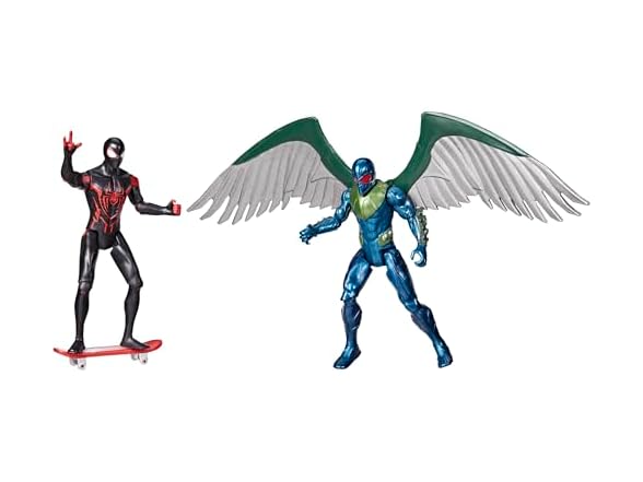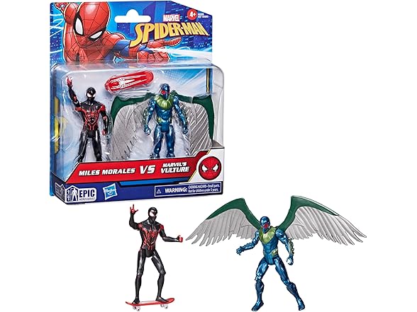 Imagine epic high-flying battles with the Marvel Spider-Man Epic Hero Series Miles Morales vs Marvel’s Vulture 2-pack! Elevate playtime with this Spider-Man toy pack, which comes with Miles Morales and Marvel’s Vulture figures, plus skateboard accessory. Figures feature multiple points of articulation for poseable play. Standing at 4 inches tall (10 cm), this action figure 2-pack for kids is the perfect addition to your little fan's collection. Spider-Man Epic Hero Series action figures for boys and girls make great gifts. Look for even more Marvel action figures and vehicles to collect across Hasbro's Epic Hero Series world of play, featuring kid-favorite characters and entertainment-inspired design. (Each sold separately. Subject to availability.) Copyright MARVEL. All trademarks and registered trademarks are the property of their respective owners. HASBRO and all related trademarks and logos are trademarks of Hasbro, Inc.