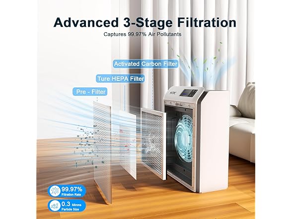 - 【3-Stage Advanced Filtration】Featuring a comprehensive 3-layer filtration system, this hepa air purifier for home effectively captures airborne contaminants. The smart indicator automatically lights up when filter replacement is needed. For optimal performance, we recommend using genuine replacement filters every 3-6 months. Enjoy effortless maintenance and trusted air purification
