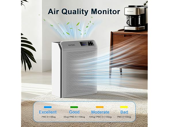 - 【Real-Time Air Quality Intelligence】Stay informed with our advanced PM2.5 monitoring system of large room air purifiers, which displays real-time air quality directly on the air purifier's display. Watch as the color-coded indicator (blue/green/orange/red) instantly reflects your air conditions. In Auto Mode, the smart sensor automatically boosts purification power when pollutants are detected, delivering proactive protection without any guesswork. Breathe with confidence, knowing exactly what's in your air.