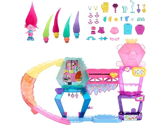 Welcome fans to Mount Rageous with this DreamWorks Trolls playset featuring Queen Poppy small doll, four Hair Pops friends, and 25+ accessories! Inspired by the iconic location from DreamWorks Trolls Band Together, the set offers two stories with a removable slide and other multiple areas of play, like a snack bar, dressing room, and stage. A Hair Pops launcher adds more happiness to playtime -- kids simply slide the gem across the bridge to see the Hair Pops fly! With lots of storytelling fashions and pieces, the Mount Rageous playset encourages imaginations to create Trolls storylines that pop. Doll cannot stand alone. Colors and decorations may vary.