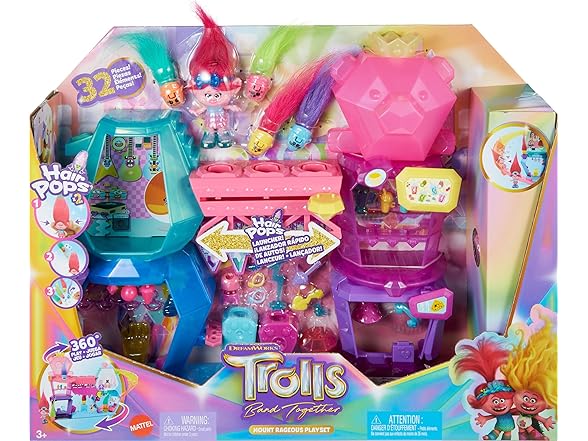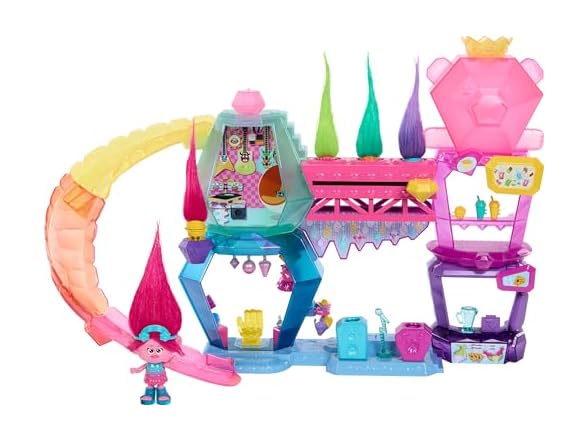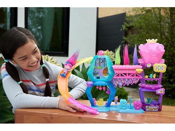 - Inspired by the vibrant location from DreamWorks Trolls Band Together, the 2-story set features a slide, snack bar, dressing room, Hair Pops launcher, stage, and more.
