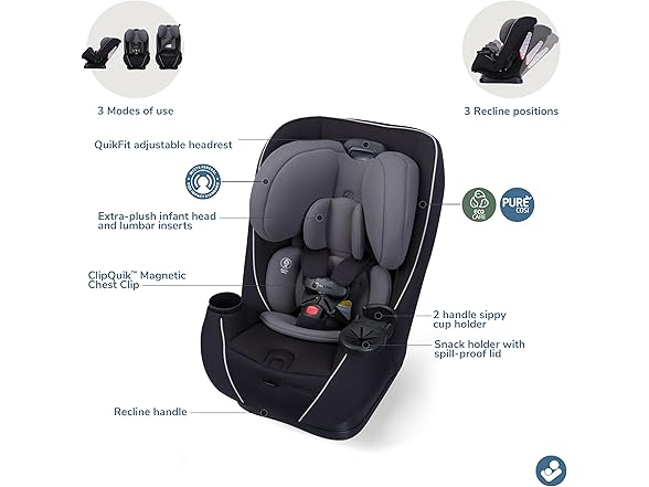 - SIT BACK AND ENJOY THE RIDE ReclineFit lets you choose from 3 reclining positions for your little one, so they can enjoy a relaxing ride wherever you go. This convenient feature helps the all in one car seat for babies and kids fit easier in your vehicle.