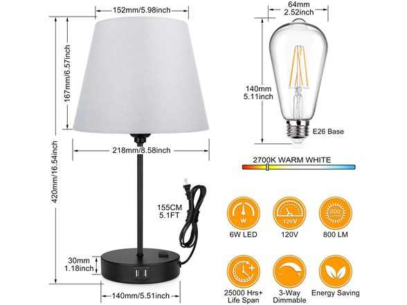 - Vintage Edison Dimmable ST64 E26 LED Bulb Included - The small table lamp for bedrooms comes with a ST64 dimmable 60W equivalent LED Vintage Bulb in the package. The Energy Saving 2700K Warm White filament 6W 800lm LED edison bulb (60 watts equivalent) can be adjusted to desired brightness, providing a glare free, non-flickering and natural lighting for reading, working and studying.