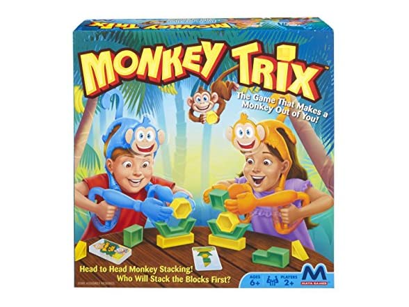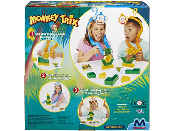 - Family game night just got even better! Pick your monkey, collect your blocks and turn over the top card. Be the first monkey to build the stack and take the card to win the round. Collect three cards to win the game. This game is recommended for ages six plus, but friends and family of all ages will love monkey Trix!