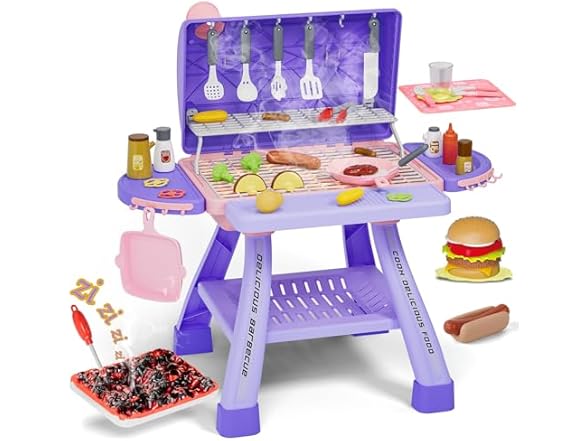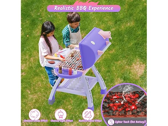 - 【Realistic Barbecue Experience】Our barbecue play set kitchen toys brings the grilling experience to life with realistic smoke, fire and sound functions. The smoke of the grill toys is safe smoke created by water vaporizer, while LED lights and crackling sounds recreate a real BBQ atmosphere, adding an authentic touch to their pretend play. Children can enhance their imagination and creativity by cooking up delicious meals with their friends