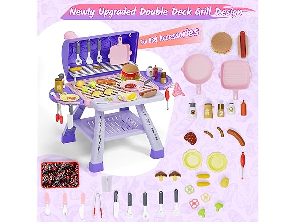 - 【Rich Accessories & Two-story Structure】Our kids BBQ grill play set toy includes a wide range of accessories(BBQ grill set, charcoal, lighter, spatula, tong, kitchen knife, table knife, spoons, fork, cup, plates, ketchup, honey mustard, sea salt, oil bottle, chili, corn, broccoli, mushroom, bell peppers, potato, mini sausages, burger, hot dog, beef, sausage, tablecloth). Double deck grill net and expandable cooking areas allows girls and boys to have more space to play, better stimulate their playfulness