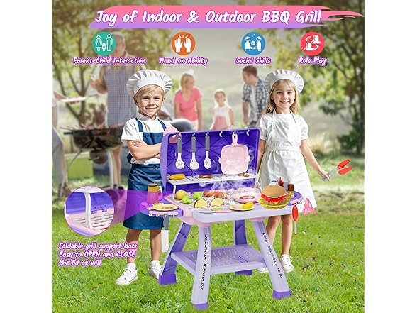 - 【Toys Grill Set for Endless Fun】Our toy grill is great kitchen playhouse accessories for kids outdoor fun, rich Accessories provide everything a little chef needs. With this barbecue toy set, kids can play with their own grill toys on the side while parents cook real food, enjoying the fun of cooking and quality family time together. Child can also play with their friends with the pretend BBQ playset to stimulate child's creative thinking and improve their hand-on ability & social skills
