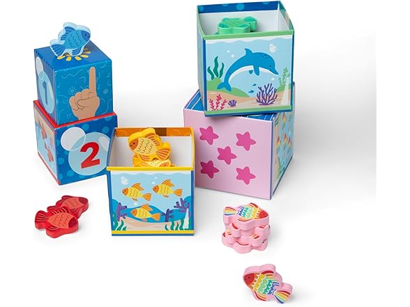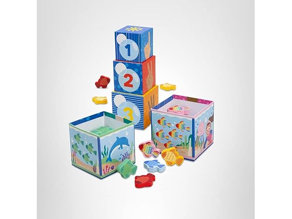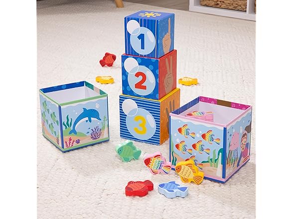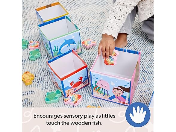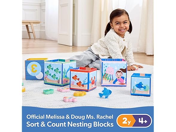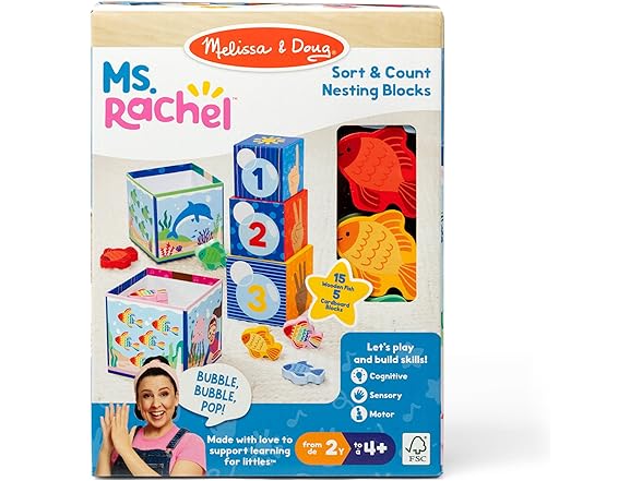 Play and learn with popular educator Ms. Rachel! Stack, sort, match, count, and learn with this fun and educational Melissa & Doug play set for toddlers and preschooler two and older. Themed after Ms. Rachel’s popular “Bubble, Bubble, Pop!” song, the five sturdy cardboard nesting cube “fish tanks” also stack into a fun tower. The sides of each cube include numerals, the corresponding number of fingers, colorful fish to count, and underwater scenes. Sort 15 wooden play fish by matching them by color and number and dropping them into the blocks! The Melissa & Doug Ms. Rachel play set includes a special bonus Learning Card with play ideas and skill-building tips for caregivers. These Melissa & Doug toys are toddler learning toys, designed by Ms. Rachel and developmental experts, to support all children through their ages and stages, from 2-5+ years. Ms. Rachel toys are ideal newborn toys, toddler toys, preschool toys, and wooden toys. From baby shower gifts to baby essentials, these products help babies and families learn, bond, and thrive. Ms. Rachel is a real teacher and passionate educator, with two master’s degrees in education, who creates research-based videos and products to support learning for littles. This product is certified by the Forest Stewardship Council. FSC certification ensures that products come from responsibly managed forests that provide environmental, social, and economic benefits, and that forests are protected for future generations. Please note that FSC certification applies to new inventory only (FSC C156584)