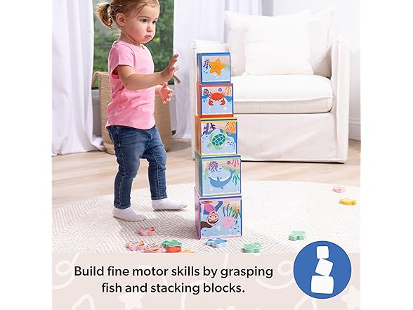 - DEVELOP MOTOR SKILLS: Grasping the fun wooden fish play pieces, dropping them into and retrieving them from the “fish tanks,” stacking, and (of course!) knocking down the blocks encourages small and large muscle development