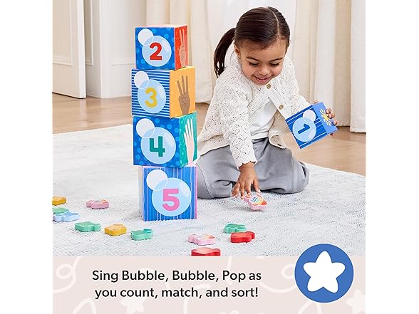 - OFFICIAL MS. RACHEL TOYS: Stack or nest 5 sturdy numbered cardboard blocks themed after Ms. Rachel’s popular “Bubble, Bubble, Pop!” song, and practice counting, matching, and sorting 15 colorful wooden fish