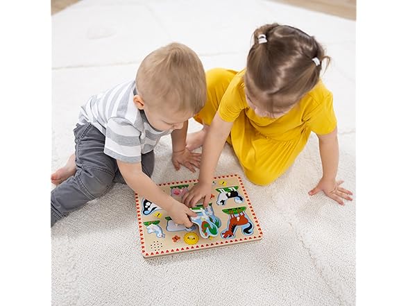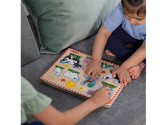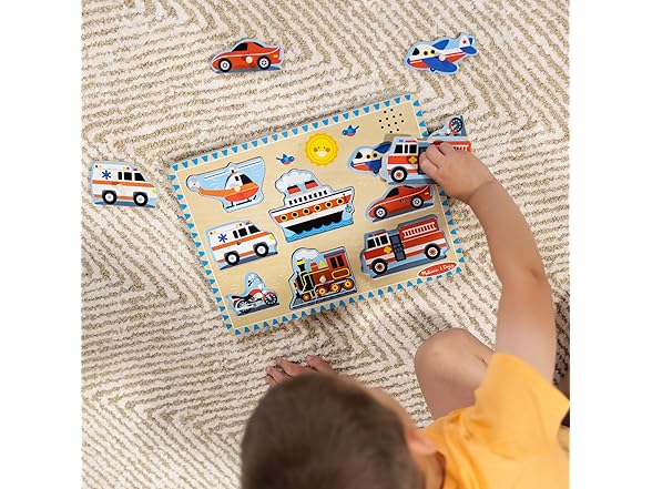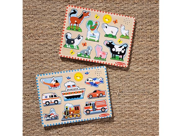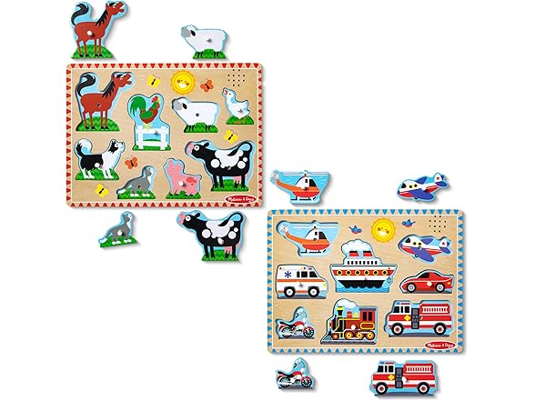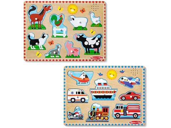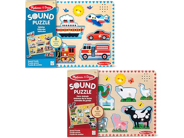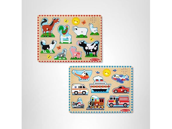Melissa & Doug Wooden Light-Activated Sound Puzzle 2-Pack for Toddler and Preschool Boys and Girls – Farm Animals, Vehicles
