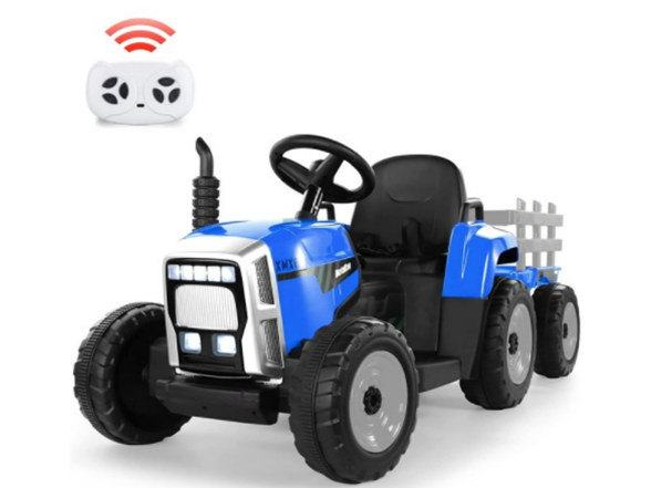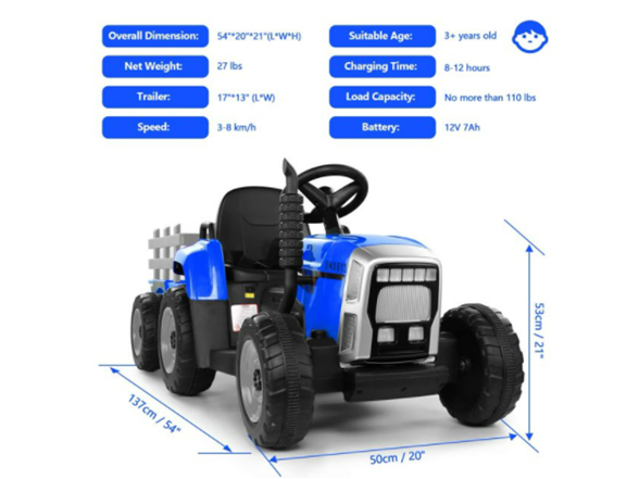 - Driving Fun with Trailer and Music: This electric toy tractor is equipped with a big trailer which can transport items not heavy, like books, toys, snacks, flowers, straw, but not people; Together with the horn button, MP3 player, blue-tooth, USB port for extra driving fun.