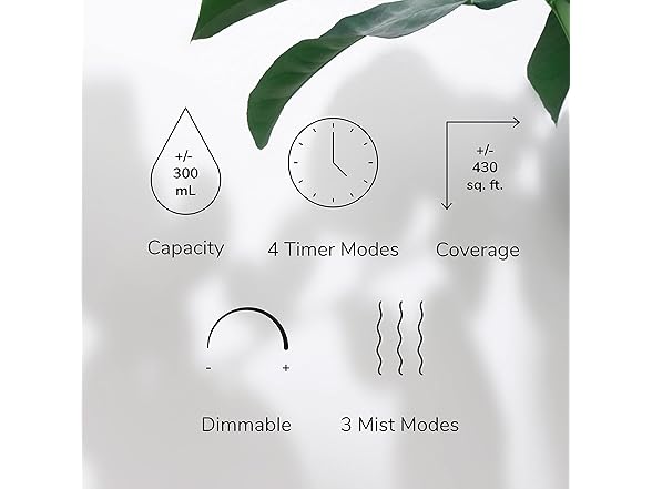 - CUSTOMIZE YOUR EXPERIENCE: With four timer settings, three mist output settings, and a dimmable light feature, you can customize your diffusion experience. Covering an area of approximately 430 square feet, it's the perfect way to naturally scent your home.