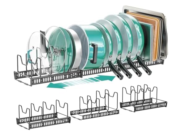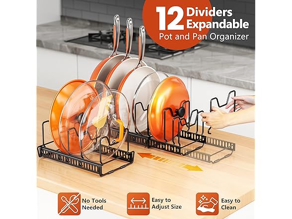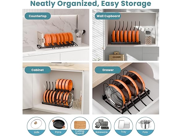 - 【Tool-Free 1-Minute Assembly】Set up your pot lid organizer for cabinet in just 60 seconds - no tools required! Our sturdy lid organizer pots and pans stays perfectly in place without wobbling, tilting, or falling apart. Just declutter your kitchen organization and storage effortlessly