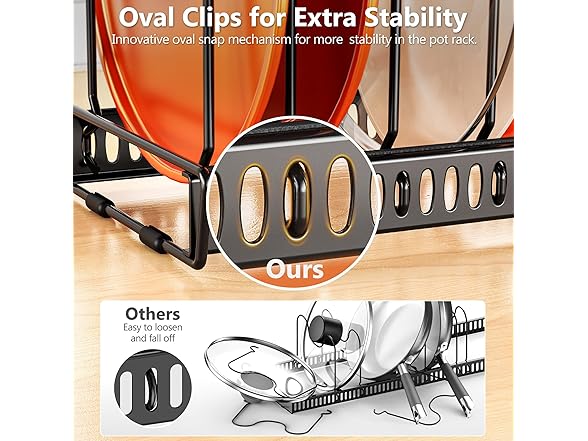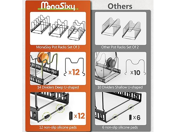 - 【Shake-free & Structurally Stable】MonaSixy pots and pans organizer under cabinet with the latest construction,with pot and pan organizer for cabinet. The flat-heel design and the mortise-tenon joint ensure a secure grip and good load capacity. No shaking,