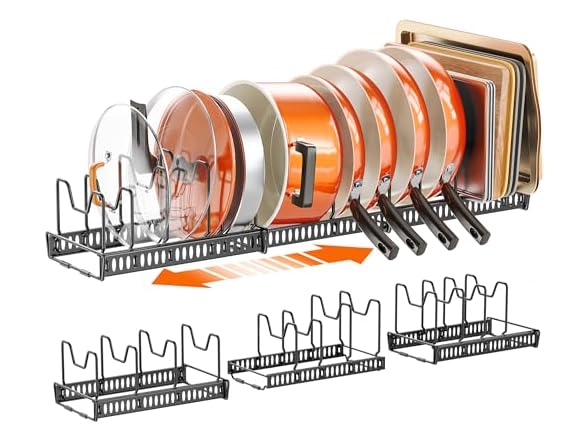 - 【Multi-Method】:Method-1, 2-tier design to maximize vertical space (19.92"L x 17.6"H) for countertop and cabinet without partition. Method-2, 2-pack function as other pan organizer in market (19.92"L x 7.1"H) and 1 individual pot rack. Method-3, 3-pack expandable design for horizontal space like kitchen table or under cabinet (30.31"L x 7.1"H). Method-4, individual for single use (each 10.63"L x 5.9"H)