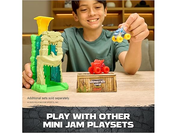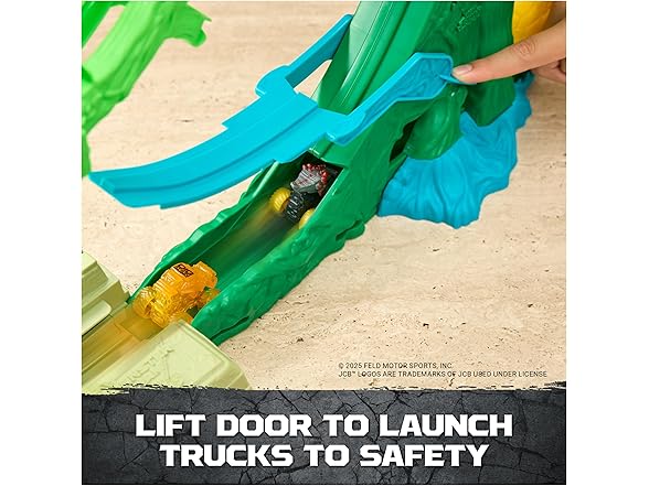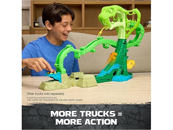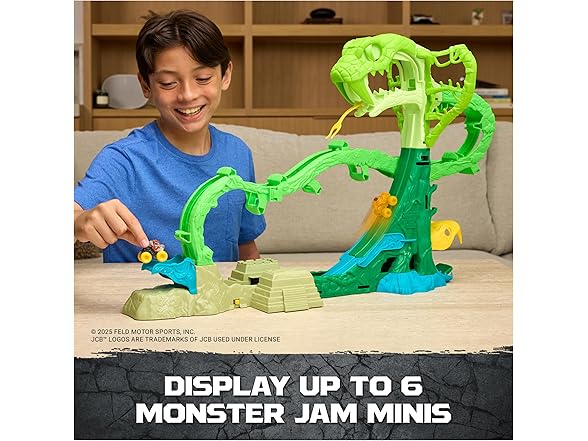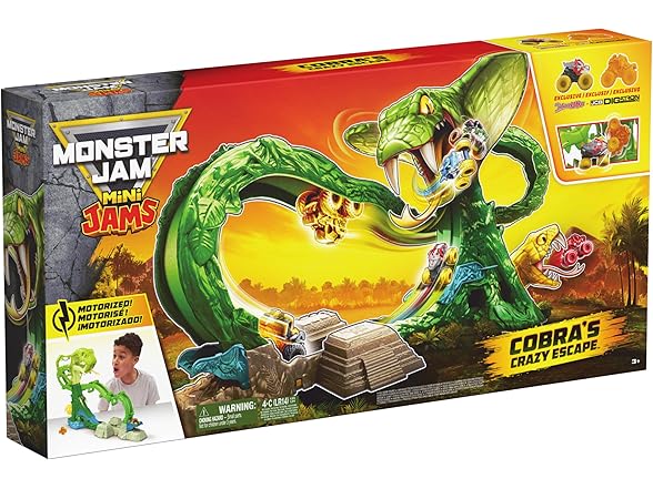 Launch into chaos with the Monster Jam, Cobra’s Crazy Escape playset. Loop into action with 2 exclusive Mini Jam trucks, ThunderROARus and JCB Digatron with gem themed details. This motorized 28-inch-long playset delivers endless excitement as you load in your trucks into the looping jungle track. (Batteries not included) How many trucks can you load into this playset? The more trucks you add, the more action you bring! Watch as your trucks flip and loop in this winding maze. Lift the hidden door lever to help your monster truck toys speed to safety through the side exit. Store and display up to 6 mini trucks as you watch them escape this maze. With so many other Monster Jam trucks to collect, add Grave Digger, Max-D, El Toro Loco and more (each sold separately) to your collection and race them all! Monster Jam toys like remote control cars and more to bring the excitement home. Bring the action with the Monster Jam Cobra’s Crazy Escape playset.