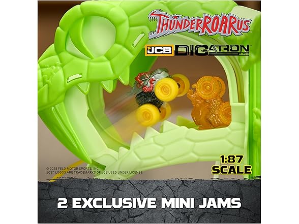 - 2 Exclusive Mini Jams: Unleash the power of ThunderROARus and JCB Digatron in 1:87 scale, feature epic gem-themed designs and fierce Monster Jam styling