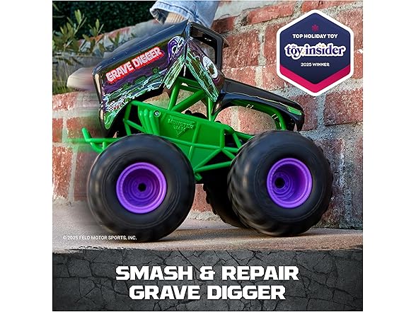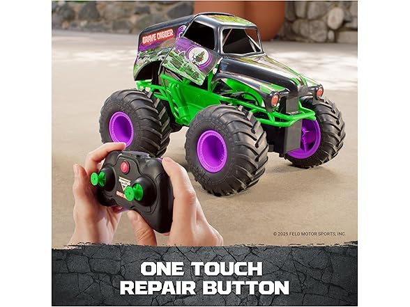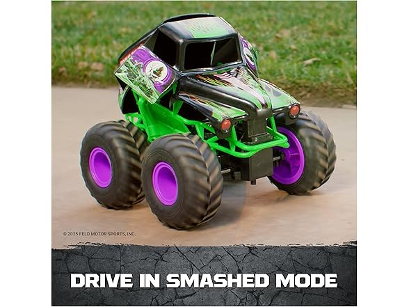 Experience the Monster Jam action in your hands with the Smash & Bash Grave Digger RC. This 1:15 scale remote control Monster jam monster truck can take the heat, running into walls and obstacles, indoors and outdoors. With soft rubber tires, authentic graphics and details, pull off epic maneuvers like you are driving the real thing with the full function, easy-to-use remote control, requires 2 AAA batteries (not included). The more you crash, the more smashed your RC becomes to perform stunts and spins. Go from wrecked to repaired with a press of a button from repeatable play. With 2.4GHz frequency, you can race up to six toy vehicles at once and control the Smash & Bash Grave Digger remote truck from up to 200 feet away for up to 20 minutes on a single charge via USB-C. With so many other Monster Jam trucks and remote control cars to collect, add Grave Digger, Megalodon, El Toro Loco and more (each sold separately) to your collection and race them all! Rev up your Monster Jam toys and get ready to experience the dirt-flying, car-crushing action of Monster Jam at home to ignite passion and adventure in any fan!