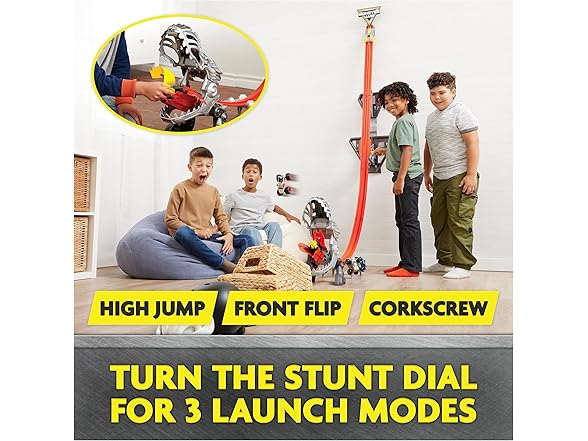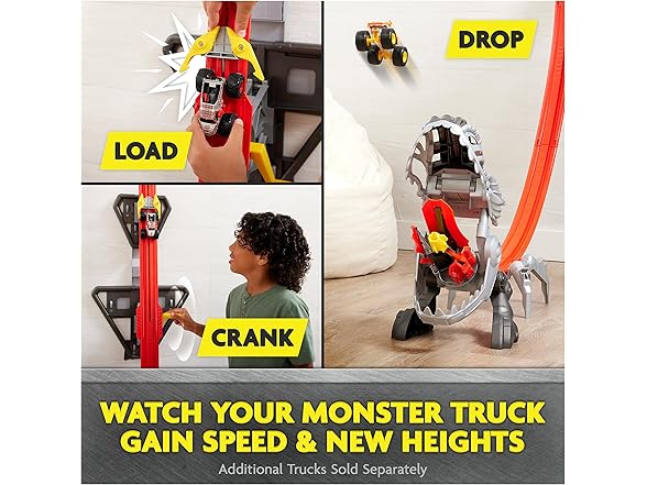 - 3 LAUNCH MODES: Load and crank your favorite Monster Jam trucks to the adjustable launch ramp. Once it reaches the top, perform awe-inspiring moves like a high jump, front flip, or corkscrew with turn of the stunt dial in the Dino’s mouth