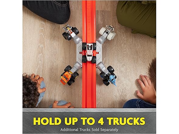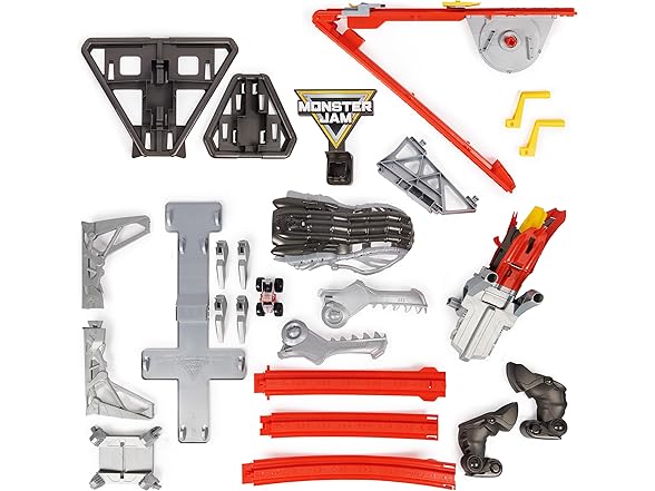- Includes: 1 1:64 Scale Monster Jam Truck, 1 Wall Bracket Top, 1 Wall Bracket Bottom, 7 Large Command Strips, Monster Jam Sign, Top Triangle Mount, Bottom Triangle Mount, 2x Crank Arms, Folding Main Track, 3 Track Pieces, Track Support, 4 Track Support Legs, Stunt dial Assembly, Feature Dino Head, Left Bottom Jaw, Right Bottom Jaw, Left Arm, Right Arm, Sicker Sheet, Landing Ramp, Landing Ramp Frame, 3 Instruction Sheets
