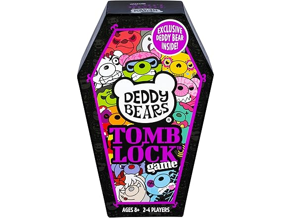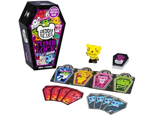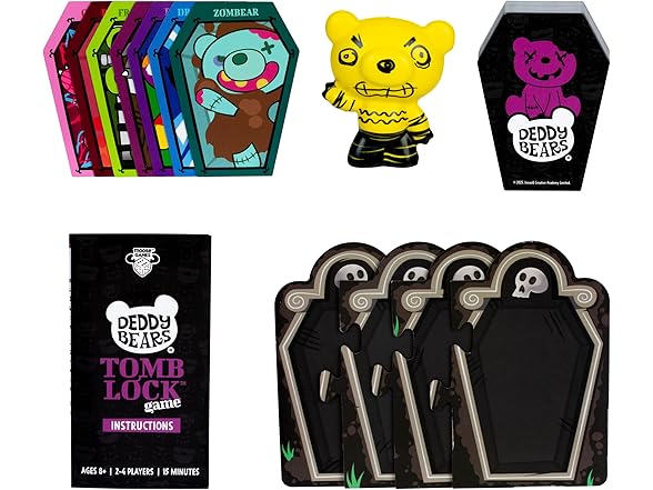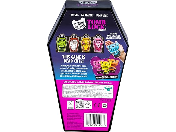 They're DEAD cute. The Deddy Bears Tomb Lock Game is where grim serious competition meets spooktacular fun! Race your friends to reap sets of these adorably eerie bears. When you do, lock a bear and block your opponent. First player to complete all their sets wins! The Deddy Bear cards come packaged in a coffin shaped box! But not just that, the Deddy Bears Tomb Lock Game includes an exclusive collectible slow-foam Deddy Bear! This fast and frantic simultaneously played game is ideal for ages 8+ for 2-4 players. Includes Exclusive 3.5" plush (or slow foam) bear figure, 52 coffin-shaped cards and instructions.