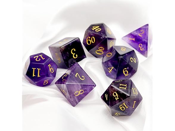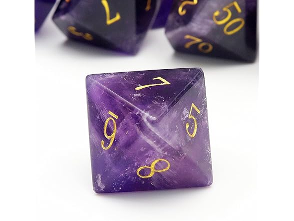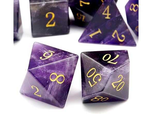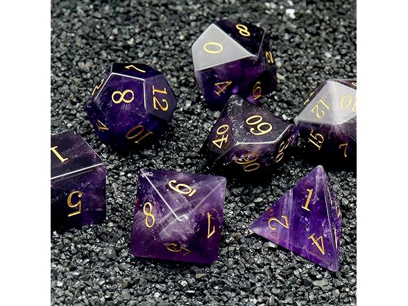 - 7PCS Real Amethyst Gemstone Dice with premium dice case. Each dice is unique because the amthyst is natural.