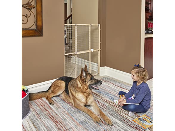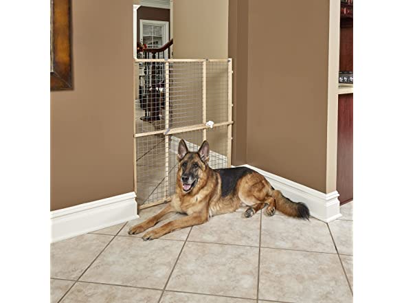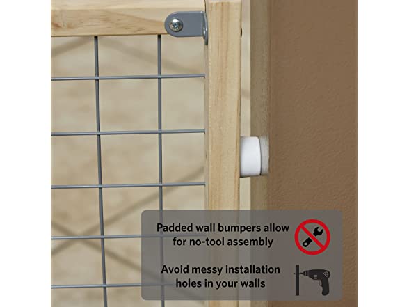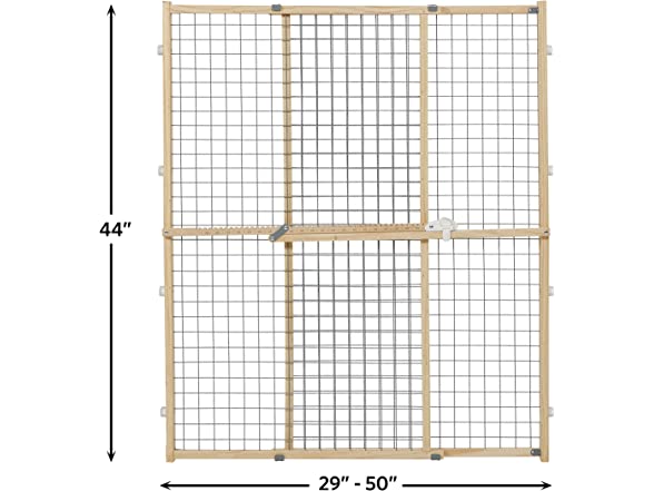 New World 50" Extra-Wide & Tall Wire Mesh Wood Pet Gate, Does Not Damage Walls, No Tool Assembly, Features Patented Locking Arm, 44H x 29-50W Inches, Natural Wood & Light Gray Mesh