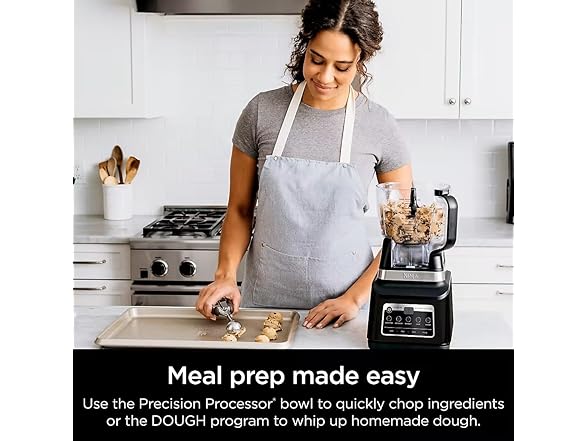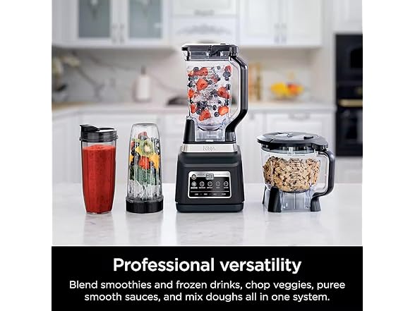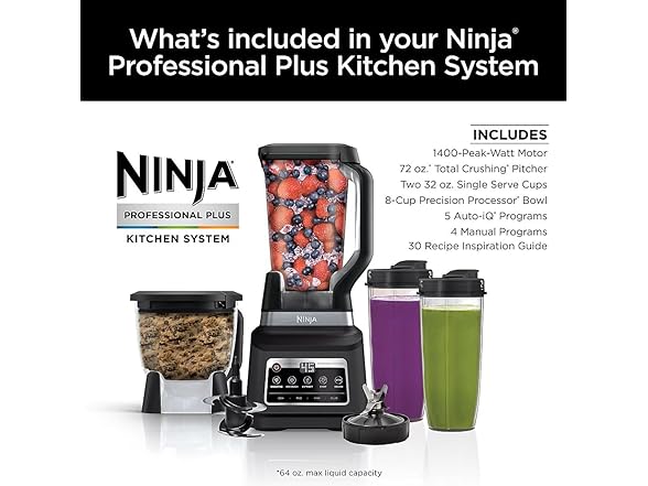 Ninja Total Crushing Blades give you perfectly crushed ice for your smoothies and frozen drinks with 1400 peak watts of professional power. The 72 oz.* Total Crushing Pitcher is great for making large batches for the whole family. *64 oz. max liquid capacity The two 32 oz. single-serve cups with spout lids make it easy to make delicious, nutrient-rich smoothies on the go. Includes two spout lids to make on-the-go sipping easy. But don’t just stop at drinks—the eight-cup Precision Processor Bowl (64 oz.) provides precision processing for even chopping, smooth purees, and up to 2 lbs. of dough. Five preset Auto-iQ programs allow you to create smoothies, frozen drinks, nutrient extractions**, chopped mixtures, and dough, all at the touch of a button. Includes four blade assemblies: Stacked Blade Assembly, Pro Extractor Blades Assembly, Chopping Blade Assembly, and Dough Blade Assembly. Check out the recipe inspiration guide with 30 recipes to get you started. Product Features: Ninja total crushing blades give you perfectly crushed ice for your smoothies and frozen drinks with 1400 peak watts of professional power The 72 oz.* Total Crushing Pitcher is great for making large batches for the whole family. Includes two spout lids to make on-the-go sipping easy The two 32 oz. single-serve cups with Spout Lids make it easy to make delicious, nutrient-rich smoothies on the go But don’t just stop at drinks—the eight-cup precision processor bowl (64 oz.) provides precision processing for even chopping, smooth purees, and up to 2 lbs. of dough Five preset Auto-iQ programs allow you to create smoothies, frozen drinks, nutrient extractions**, chopped mixtures, and dough, all at the touch of a button Contains four blade assemblies: stacked blade assembly, pro extractor blades assembly, chopping blade assembly, and dough blade assembly Check out the Recipe Inspiration Guide with 30 recipes to get you started Includes Pitcher, two 32 oz. single-serve cups, stacked blade assembly, recipe inspiration guide