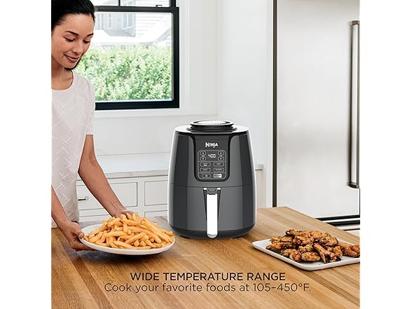 Time is precious, even more so when you’ve got hungry mouths to feed. Why wait for your oven to preheat and then slowly cook that highly anticipated meal when there’s a quicker way to put food on the table for your whole family? Meet the Ninja Air Fryer, a fast and easy way to cook your favorite foods. It ensures even circulation of hot air around your food for quick, crispy, and golden finishes, every time. The secret is the smart processor that delivers a wide temperature range while powering the fan that automatically adjusts speeds based on your cooking function, allowing you to cook and crisp your favorite foods, like 2 lbs. of French fries, using little to no oil in a family-sized 4-quart ceramic-coated basket. The wide temperature range gives you the ability to roast, bake, air fry, reheat, or dehydrate foods, making it your new go-to appliance for any meal or snack. With the Ninja Air Fryer on your countertop, you can pull crispy meals out of thin air.