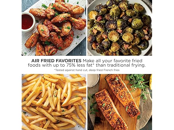 - LESS FAT: Now enjoy guilt-free food. Air fry with up to 75% less fat than traditional frying methods. Tested against hand-cut, deep-fried French fries.