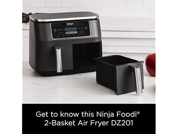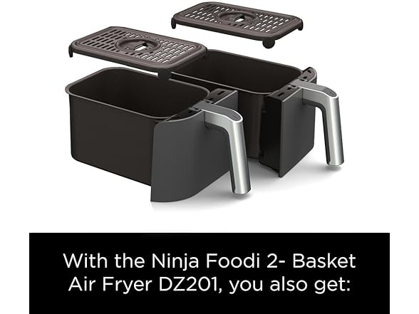 In the Box:- (1) Ninja DZ201 Foodi 8 Quart 6-in-1 DualZone 2-Basket Air Fryer with 2 Independent Frying Baskets, Match Cook & Smart Finish to Roast, Broil, Dehydrate & More for Quick, Easy Meals, Grey