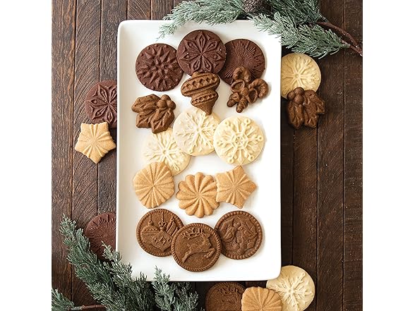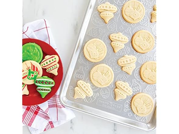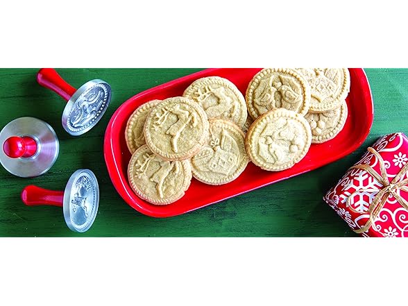 - Simply roll dough into balls and press to produce 3D embossed holiday designs with or without frosting.
