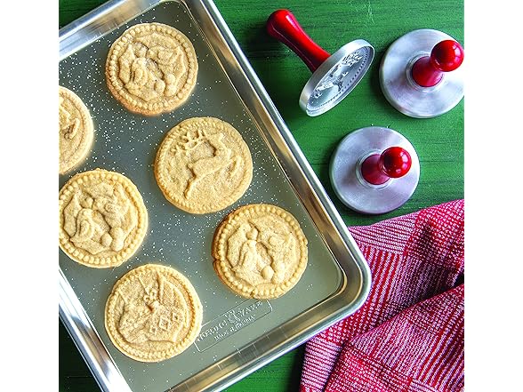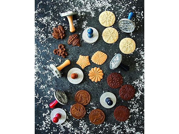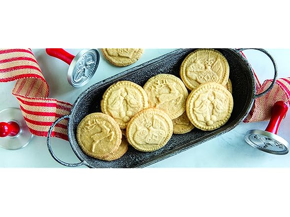 Built for generations of use these cast aluminum cookie stamps combine style, durability, and innovation. The intricate designs will transform your ordinary cookies into edible works of art. These cookie stamps are to be used with shortbread, sugar cookie, gingerbread, and cookie recipes that don't spread! Cookie stamp impressions will not be as defined if using prepackaged cookie mixes or refrigerated dough. For best results, chill dough and stamps before using. Roll dough balls in sugar or dust stamps with a little flour before scooping and pressing out dough directly onto a baking sheet. This will ensure they don't stick and come cleanly off the stamp. The design presses right into the cookie and helps create a simply gorgeous design that needs no decorating! Great for gifting plain or add a simple glaze for a sweet display. Set features three cookie stamps crafted of durable, sustainable cast aluminum and wooden handles. The sturdy hardwood handles provide a comfortable, secure grip, making stamping both easy and enjoyable. Hand wash only, never submerge wooden handles in water they should be wiped clean. Made in America of domestic and imported materials.