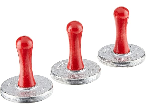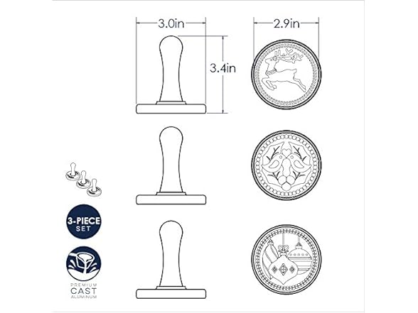 - Set of 3 cast aluminum stamps with wooden handles. Hand wash only. Never submerge wooden handles in water, wipe clean.