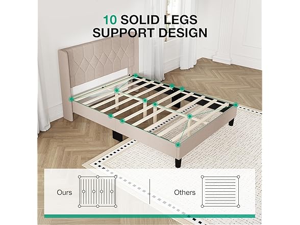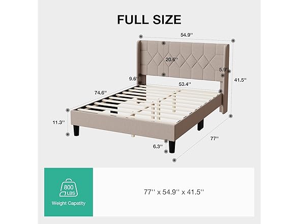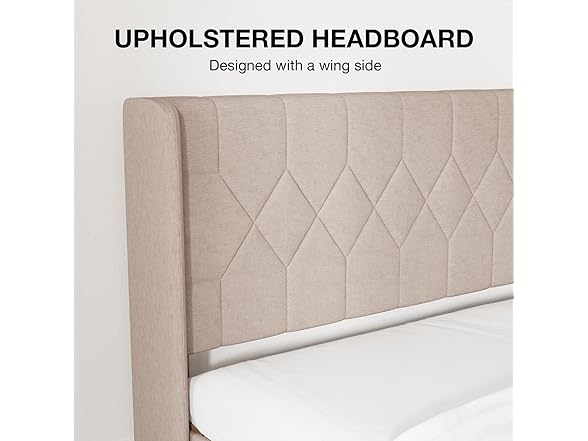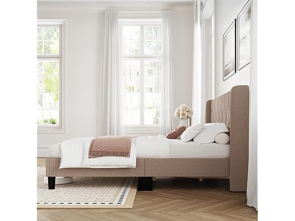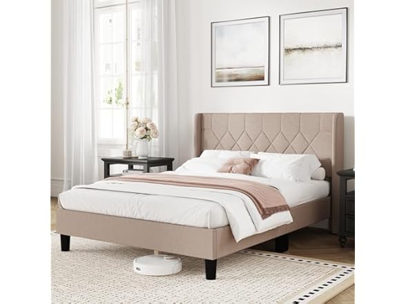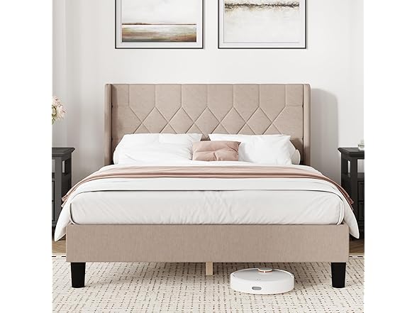 Novilla Full Size Bed Frame, Full Bed Frame with Headboard, Linen Upholstered Pull-Point Wing Side Headboard, No Box Spring Needed, Heavy Duty Feet, Easy Assembly, Beige
