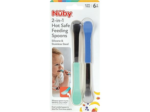 - SPOON SET FOR BABIES 6+ MONTHS: Nuby's 2-in-1 Hot Safe Spoons are perfect to use at breakfast, lunch, and dinner; Spoon design helps to scoop food from hard-to-reach areas in baby food jars