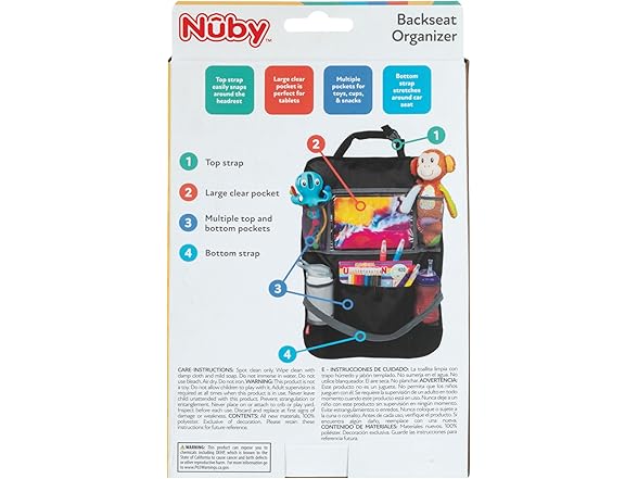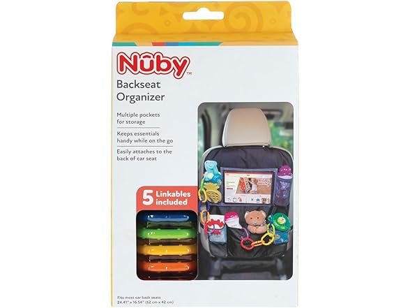 Are you tired of the mess child toys and care products can leave in your car? Do you want a more Simple way to organize your Baby's Travel Essentials? Top straps around head res. Clips for toys. Dual side pockets. Mesh storage pockets. Bottom strap wrap around car seat. Removable travel pouch with clear front. holders fits up to 11 Oz bottles. omes with a touch screen iPad display holder. We know how impatient your children can get, and now they can watch their favorite shows or play their favorite games while on the go. Our Nuby mission is to create infant and juvenile products that are safe, fun, creative and most of all innovative. Products that are used daily and become a highlight in a baby's early years. Travel is smart and convenient with Nuby's Linkables. These handy, colorful links add convenience and delight to time spent away from home with interlocking features that allow you to attach toys to strollers, car seats, and more. Use the Linkables to keep toys secure or on their own for play! The durable, flexible links keep baby's toys within easy reach. Their textured design provides new tactile sensations little hands will love exploring as they build fine motor skills. Bright colors captivate your child's attention and stimulate their sense of sight during play. The links are not only easy to use, but also easy to clean with a wet cloth and mild soap. Go ahead, make life a little less crazy and a lot more fun with Nuby's Linkables.