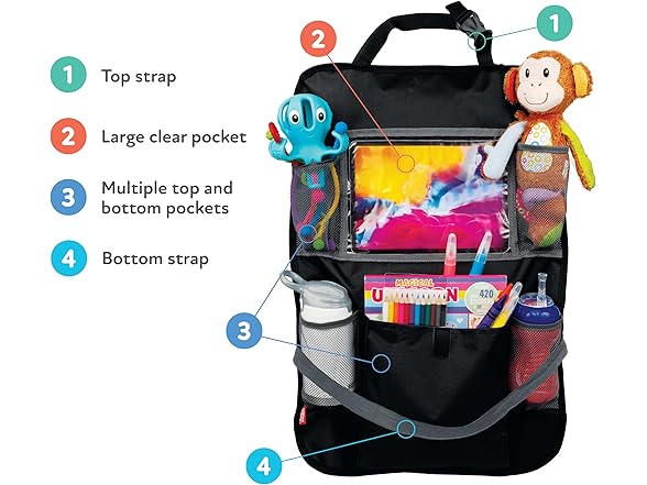 - 【MULTIPLE STORAGE POCKETS & 5 STURDY LINKABLE HOOKS】 Mesh and clear storage pockets keep snacks, water bottles, wipes, toys and more within reach and organized. The five Linkable hooks can connect to the organizer, car seat creating additional storage for water bottles, toys and other small accessories.