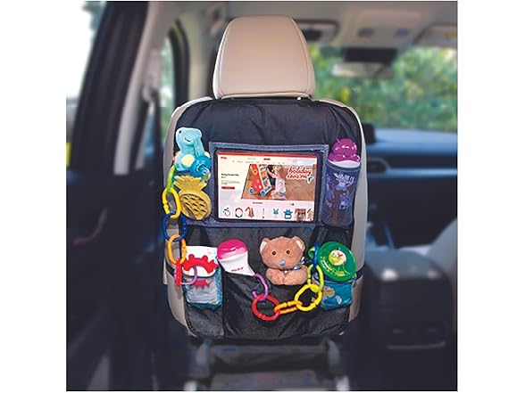- 【KEEP YOUR CAR ORGANIZED AND ESSENTIALS WITHIN REACH】 Keeps all your child's essentials in one place and organized with Nuby’s Backseat Car Organizer Set. The set features multiple storage pockets, tablet holder, and five sturdy linkables hooks clip to hold extra accessories.