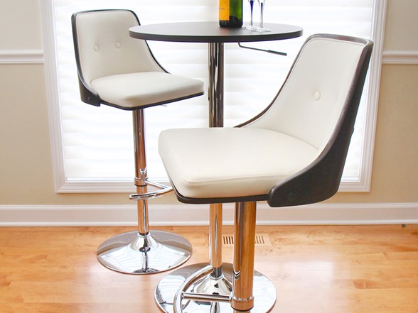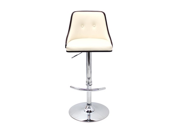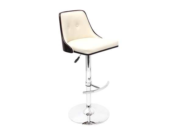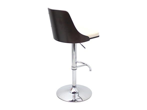 Relax in art deco style with the Nueva Bar Stool! This adjustable height stool with footrest will add an artful touch of style to any room with its wooden backrest and padded leatherette seating. The seat swivels 360 degrees for an added element of comfort and convenience.