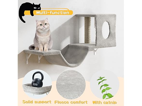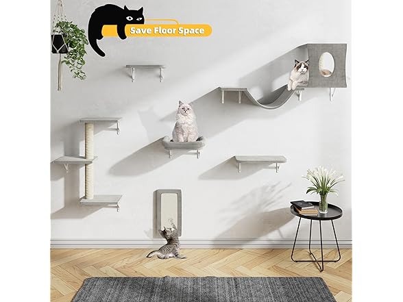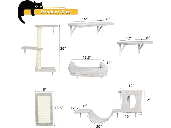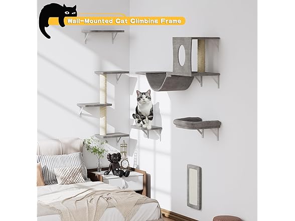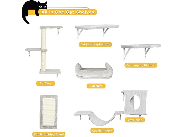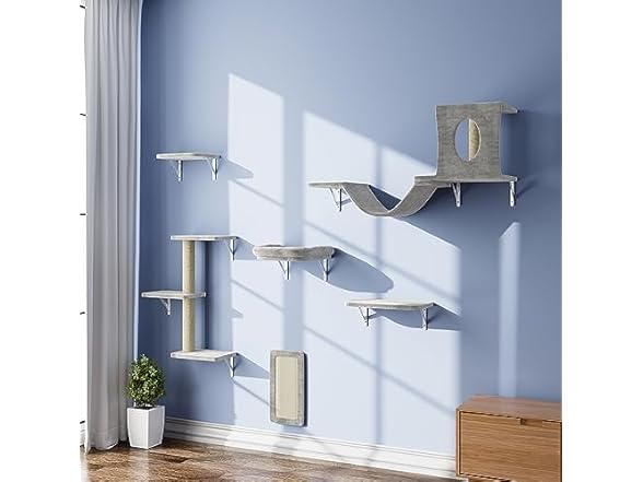 NUNU LAB Wall Mounted Cat Furniture Set - 6 Pcs Climber Set with House, Bridge, Steps, Scratcher Board - DIY Walls Playground, Indoor Cat Shelves - Gray