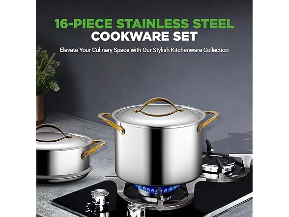 - ELEGANT & STYLISH LOOK: Featuring hollowed cast stainless steel finish with golden PVD handles, this kitchenware set will be perfect if you want an elegant feel for your kitchen. Cook with style using new and flashy kitchenware.