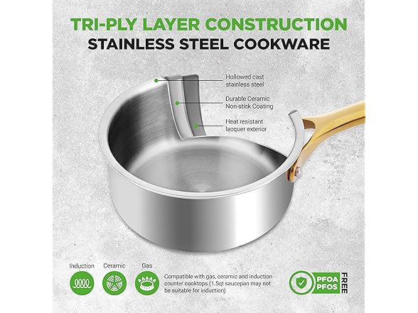 - COOKTOP COMPATIBILITY: Cook anywhere and however you would like -these pots and pans are safe for use in gas, electric, ceramic & induction cooktops (1.5qt saucepot may not be suitable for induction). Also effectively distributes and retains heat.